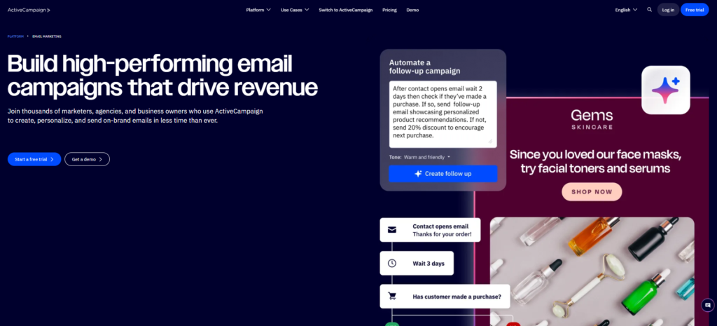 ActiveCampaign is a powerful all-in-one marketing automation tool built for businesses that want advanced features. It offers detailed automation workflows, built-in CRM, and deep audience segmentation. For example, you can send personalized email sequences based on user behavior, such as clicks, purchases, or page visits.