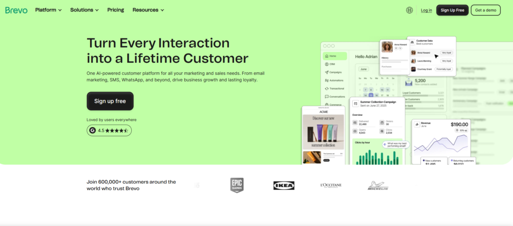 Brevo (formerly Sendinblue) is built for simplicity and multi-channel marketing. You get email campaigns, SMS marketing, transactional emails, a built-in CRM, and basic automation in one dashboard. It’s a strong choice if you want everything in one place without a steep learning curve.