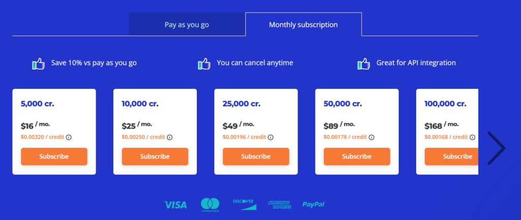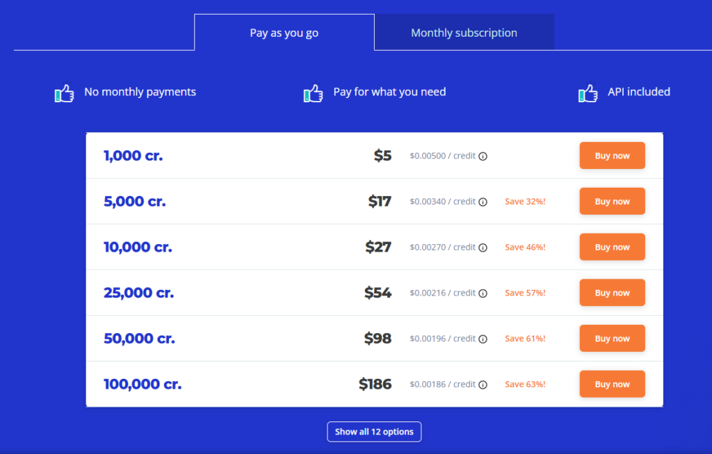 Email list cleaning is not a daily necessity for many marketers, but rather a recurring task. EmailListVerify caters to this by allowing you to purchase credits as needed.