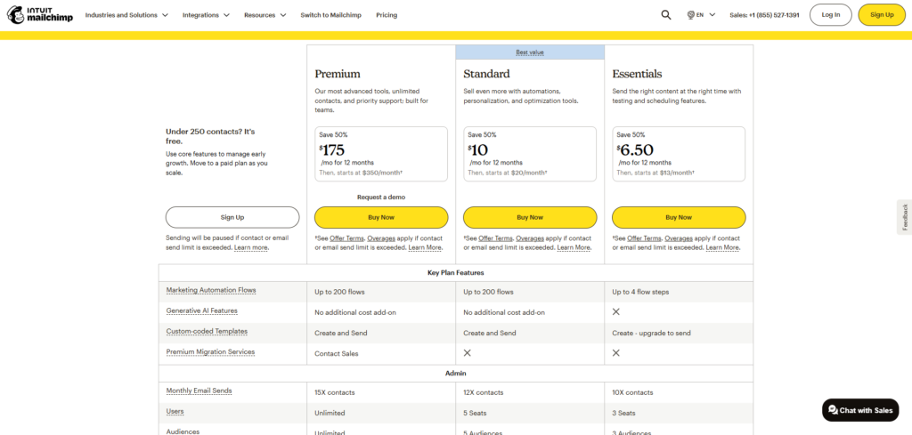 | Standard | $20/month | Scales with list | Advanced automation, segmentation, AI tools, better analytics |