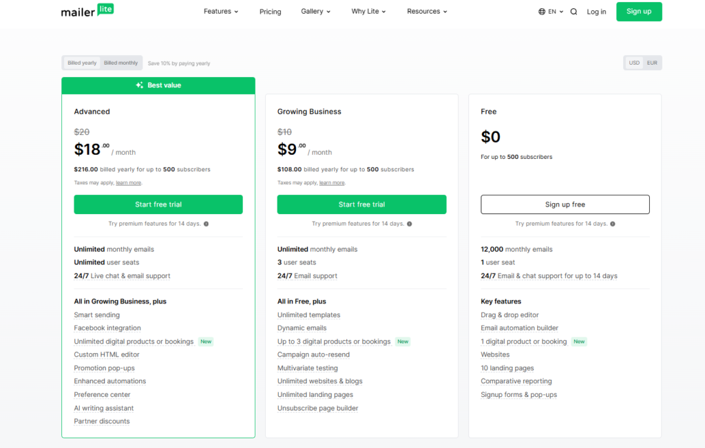 One important thing to know is that pricing grows as your email list grows. This means MailerLite is cheap at the beginning, but costs can increase over time.