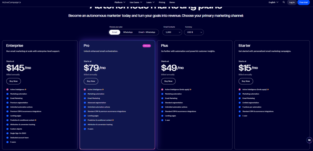 A tiered pricing structure based on contacts and features is used by ActiveCampaign. Basic email marketing is included in entry-level plans; advanced automation, CRM, lead scoring, and sales pipelines are added in higher tiers. This structure is intended for companies that require marketing automation and more in-depth customer journeys.