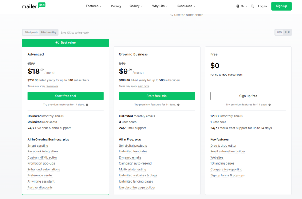 MailerLite was designed with affordability and ease of use in mind. It provides basic email features in a free plan for small lists. Paid plans unlock advanced features like automation, landing pages, and priority support and scale primarily based on the number of subscribers. Because of this, MailerLite is a great option for novices, bloggers, and small companies looking for fixed prices.