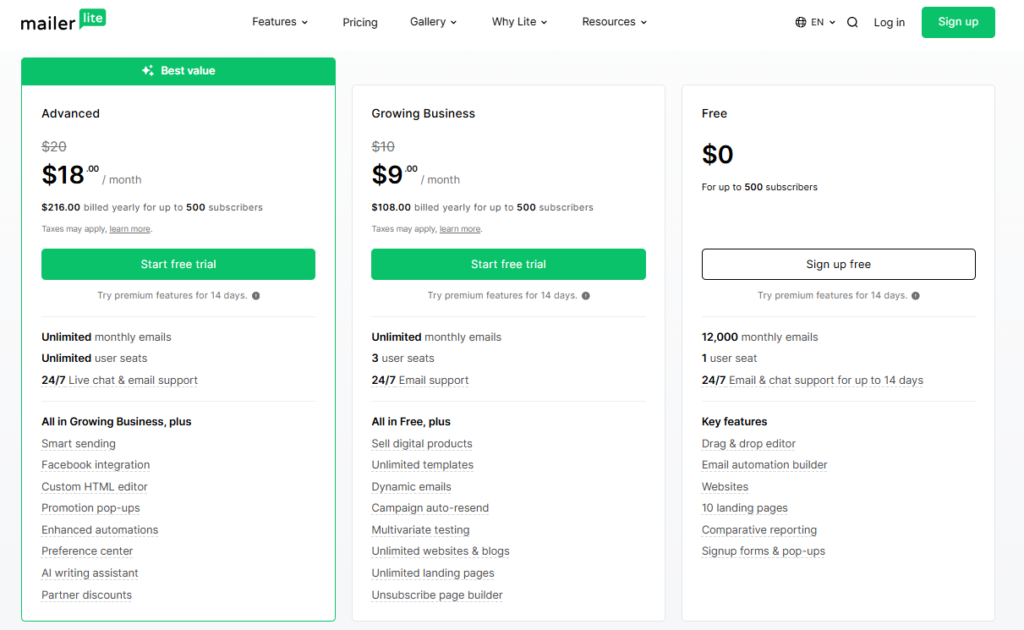 MailerLite offers a generous free plan that supports up to 1,000 subscribers and 12,000 emails per month. Paid plans start at around $10 per month and scale predictably as your list grows.