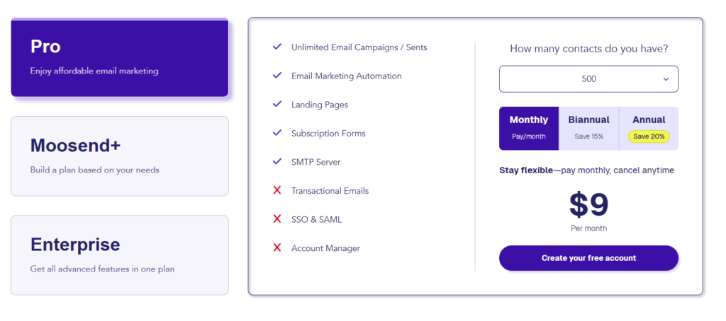 Moosend pricing is based on the number of subscribers. Plans start at a low monthly cost for small lists and increase as your subscriber count grows. All Pro plans include unlimited emails and automation features.