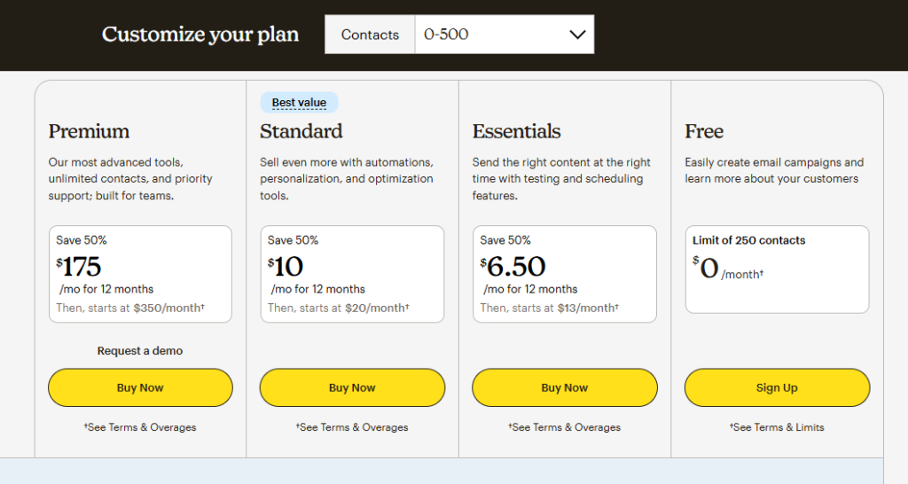 Mailchimp’s pricing has become increasingly restrictive in 2026, with a Free tier capped at 250 contacts and only 500 monthly sends. The Omnisend vs Mailchimp gap widens at the $20 Standard tier, where Mailchimp finally unlocks multi-step automations that come standard on all Omnisend plans. Beyond the base price, users often encounter hidden costs through send-limit overages (capped at 10x–12x your contact count) and mandatory add-ons for SMS. For an enterprise-level list of 50,000 contacts, Mailchimp’s Premium plan can exceed $800, making it a significantly higher investment for the same reaching power offered by its competitors.