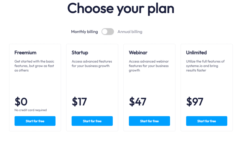Systeme.io Pricing Plan Comparison: Free vs Startup vs Webinar vs Unlimited